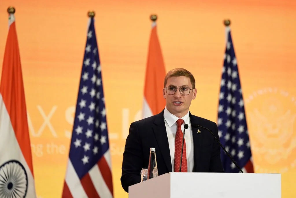 Under Secretary of State for Economic Affairs Jacob Helberg speaks at the AI Impact Summit in New Delhi, India, Friday, Feb. 20, 2026. (AP Photo)