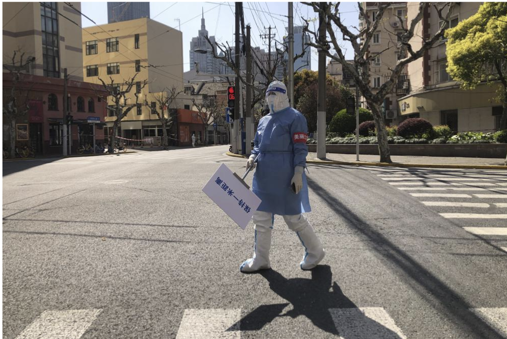 A worker in protective gear holds a sign which reads "Keep one meter apart" along an empty street in a lockdown area in the Jingan district of western Shanghai, Monday, April 4, 2022. Photo: Chen Si via AP Photo
