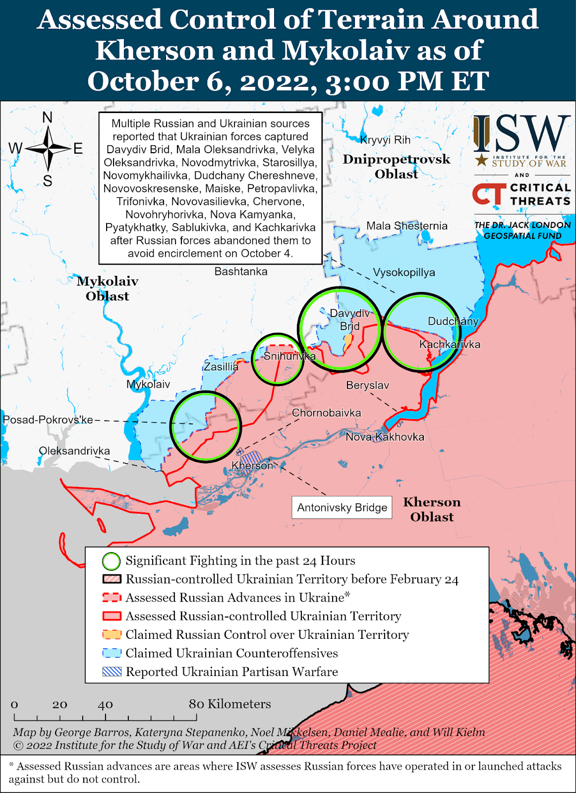 In the first week of October, Ukrainian troops made significant advancements in their counteroffensive in the Kherson Oblast. Beginning in late August, alongside the operation in the Kharkiv Oblast, the southern counteroffensive’s initial goal has focused on securing the two crossings across the Dnipro River and liberating the city of Kherson.
