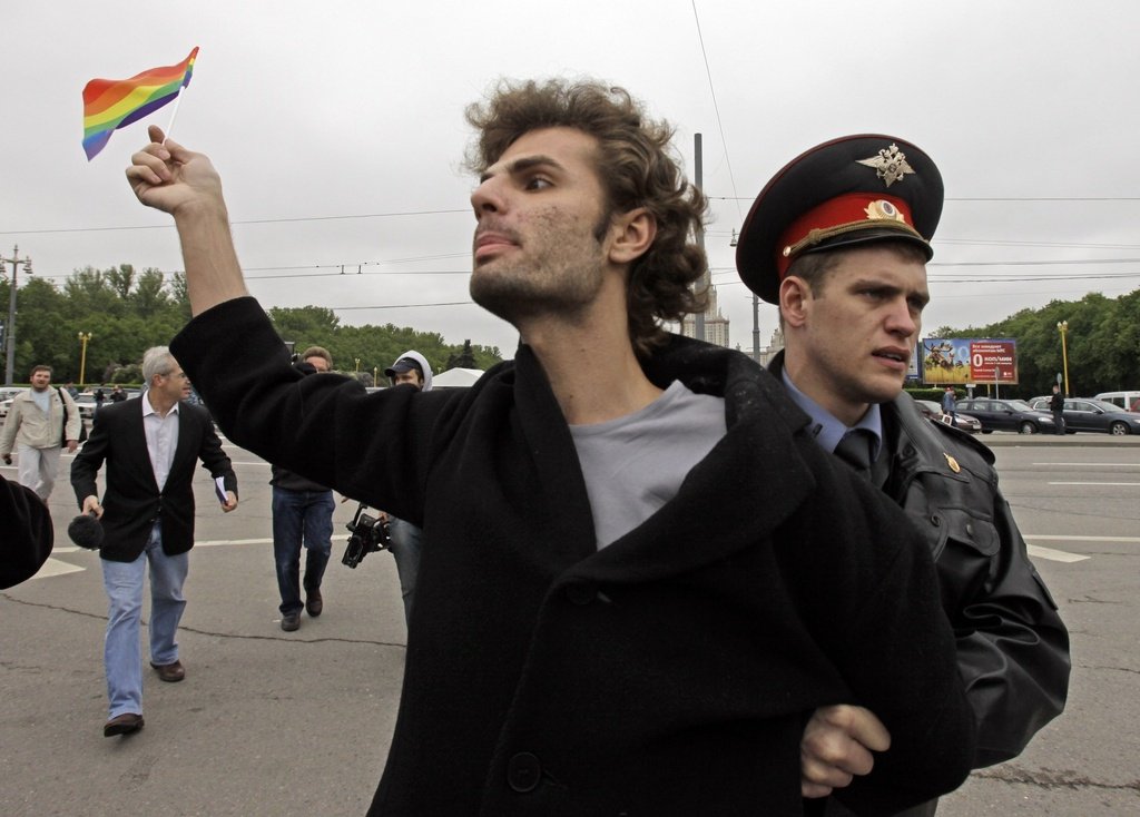 A gay rights activist being detained by police in Moscow in 2009. (AP Photo, File)