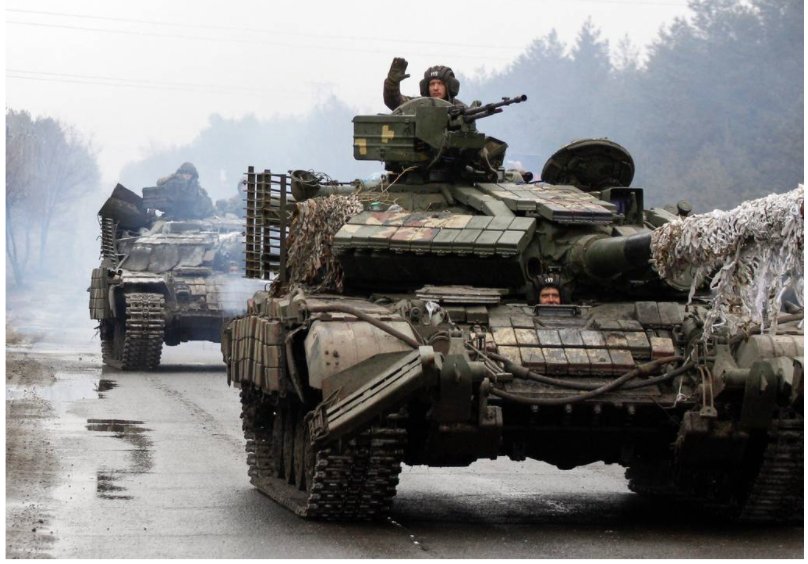 Ukrainian servicemen ride on tanks towards the front line to meet Russian forces in the Lugansk region of Ukraine on Feb. 25, 2022. Photo: Anatolii STEPANOV / AFP