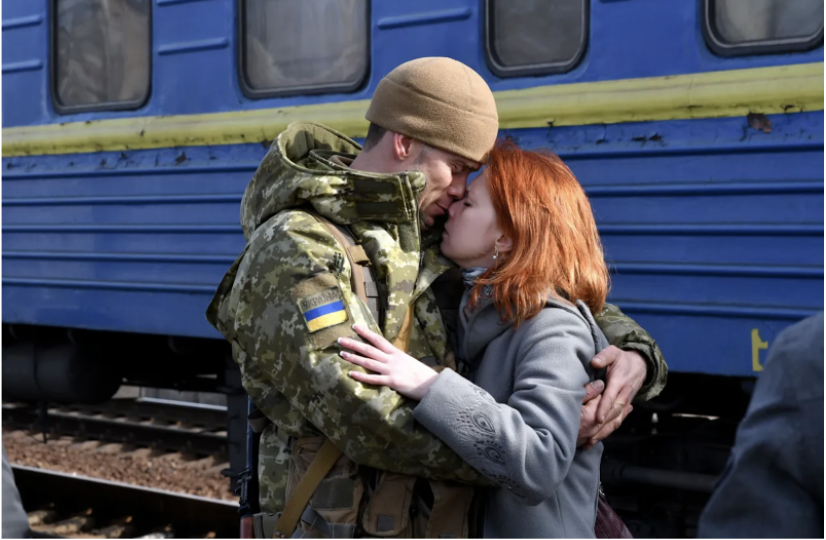 A couple embraces before separating in eastern Ukraine on Feb. 27, 2022. Photo: Andriy Andriyenko / AP