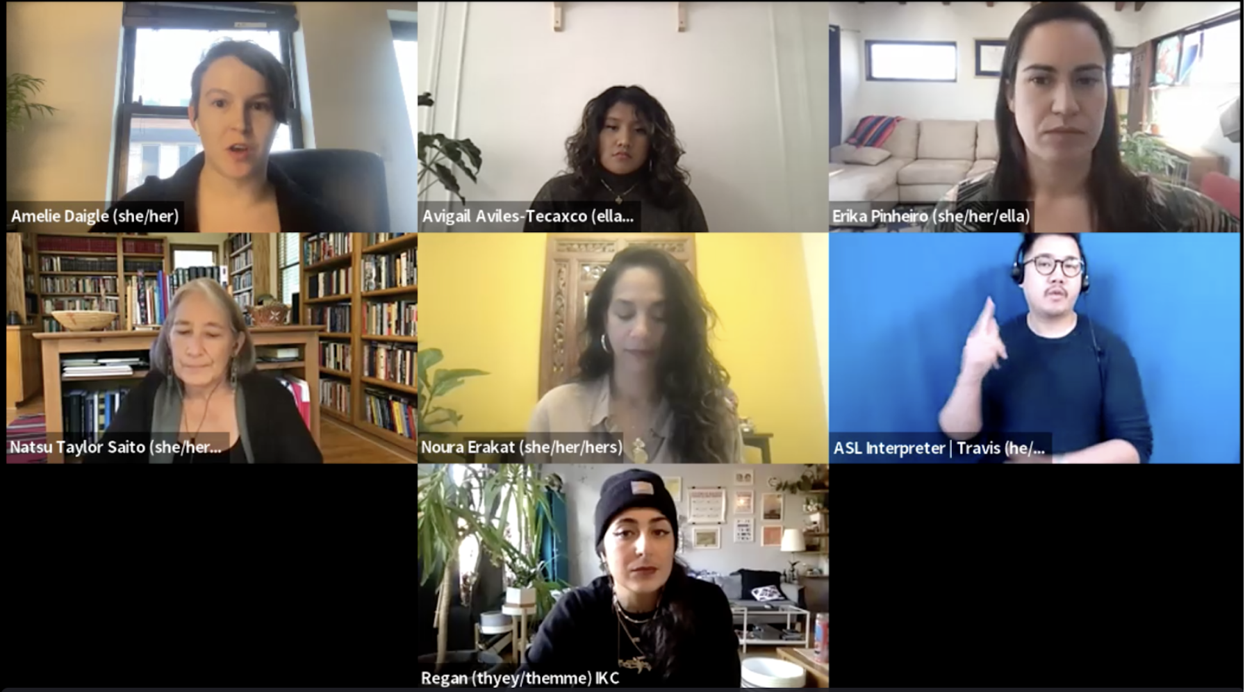 Opening remarks by Amelie Daigle and panelists Avigail Aviles-Texaco, Erika Pinheiro, Natsu Taylor Saito, Noura Erakat, and Regan Delogans (top left to bottom right)