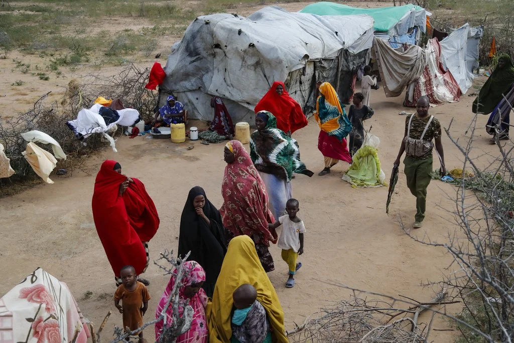 Somali refugees and an armed Kenyan policeman walk next to a makeshift shelter in Dadaab refugee camp in northern Kenya, Thursday, July 13, 2023. One of the world's largest refugee camps offers a stark example of the global food security crisis with thousands of people fleeing Somalia in recent months to escape drought and extremism but finding little to eat when they arrive at the Dadaab camp in neighboring Kenya. (AP Photo/Brian Inganga)