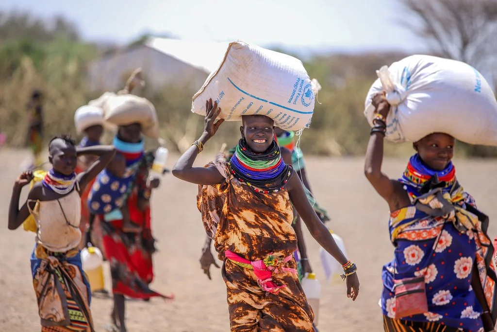 Women walk home after receiving food aid from the World Food Programme (WFP) and World Vision Kenya in Nadunga Village, Turkana County, Kenya, Friday, Feb. 6, 2026. (AP Photo/Patrick Ngugi)