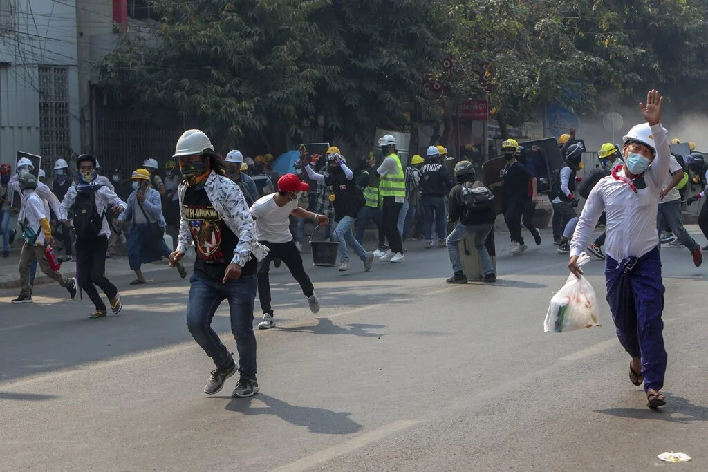 Anti-coup protesters run from teargas and charging riot police and soldiers in Mandalay, Myanmar, Wednesday, March 3, 2021. Demonstrators in Myanmar took to the streets again on Wednesday to protest last month's seizure of power by the military. (AP Photo)