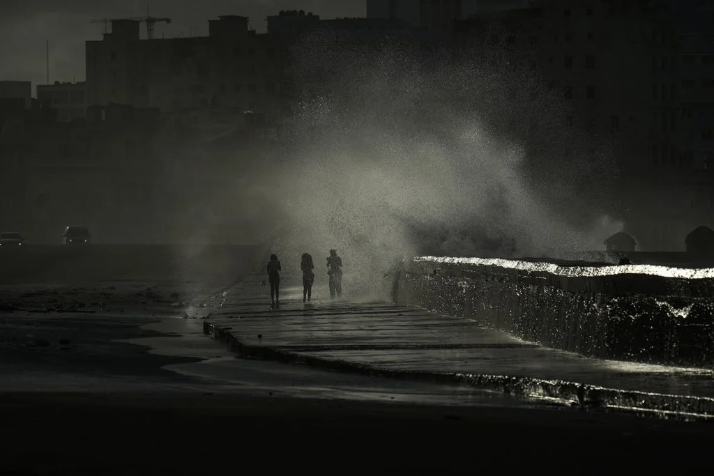 People walk along the boardwalk as waves crash during a power outage in Havana, on Monday, Oct. 21, 2024. (Photo: AP Photo/Ramon Espinosa)