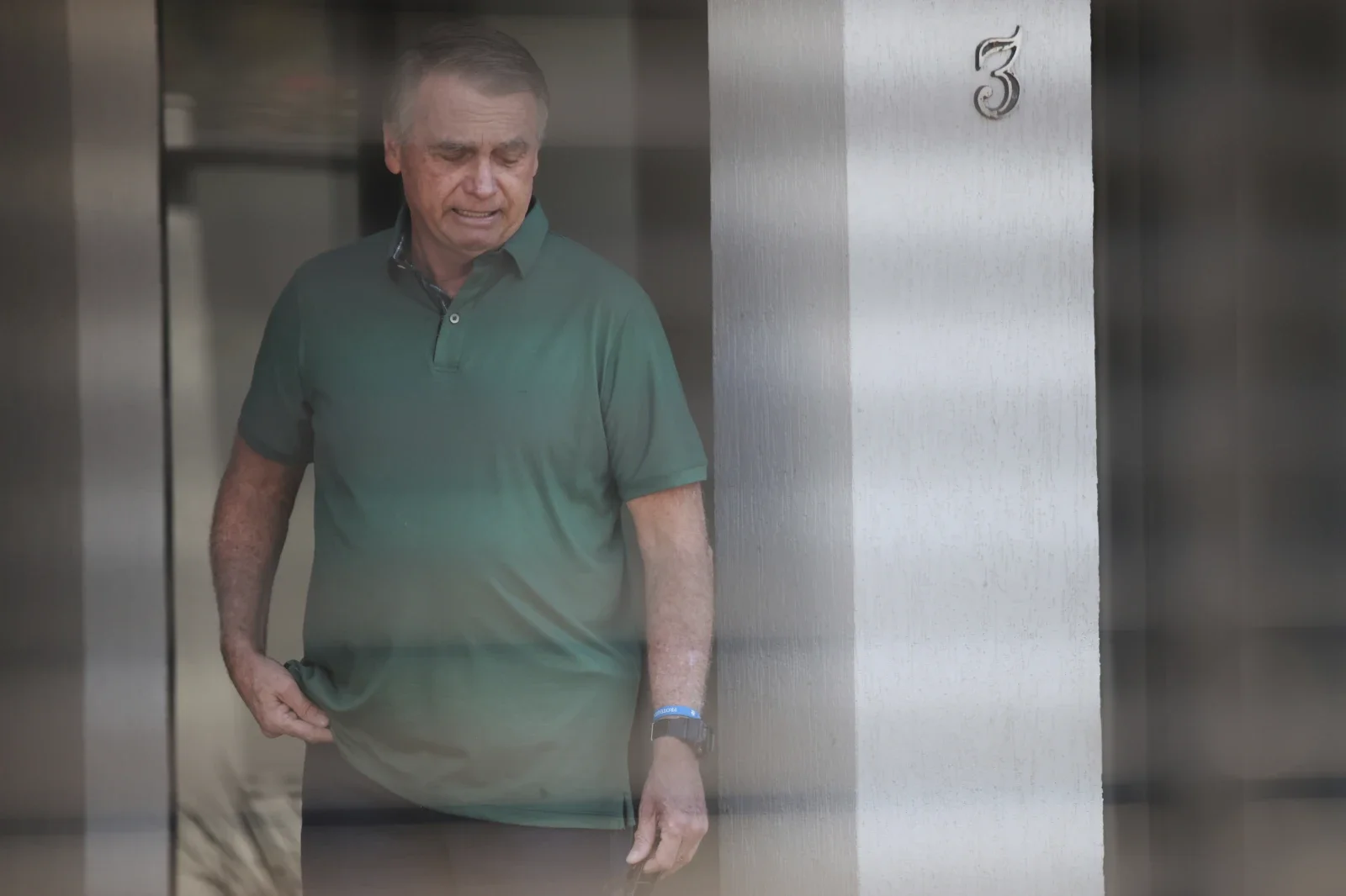 Brazil’s former President Jair Bolsonaro stands at the entrance of his home where he is under house arrest in Brasilia, Brazil, Thursday, Sept. 11, 2025. (AP Photo/Luis Nova)