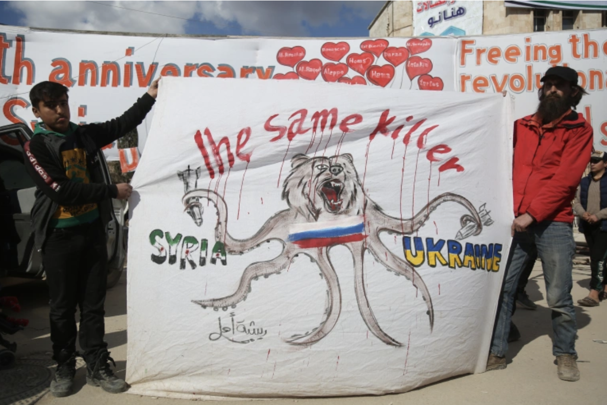 A protest in Syria’s Idlib province in March of 2022 compares Russia’s bloody impact on Syria’s Civil War to its invasion of Ukraine this year. Photo: Ali Haj Suleiman for Al Jazeera