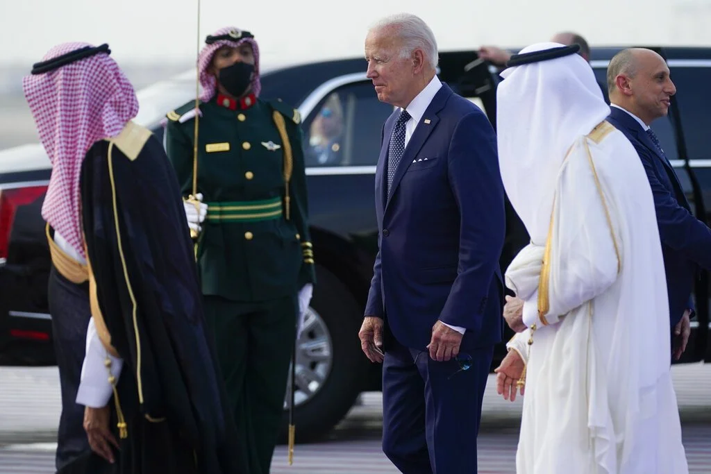 US President Joe Biden meeting with Saudi officials in Saudi Arabia on August 15, 2022 to negotiate an increase in oil production. (AP Photo/Evan Vucci)