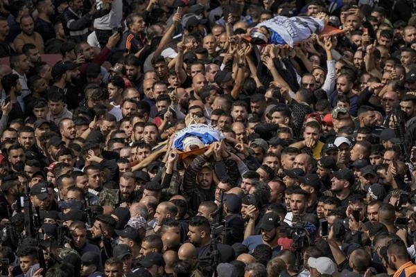 Thousands of Palestinians attended the funeral of six Palestinian militants killed by the IDF Tuesday morning. Photo: AP News/Majdi Mohammed