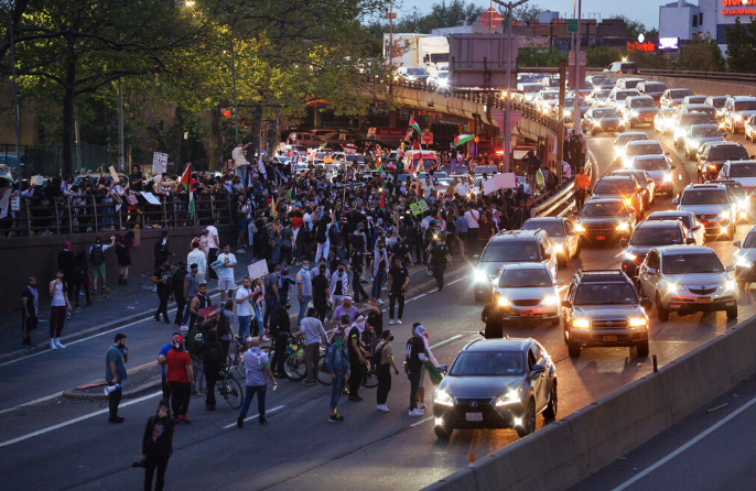 Activists blocking traffic in support of Palestine in New York in May, 2021. Photo: AP/ Kevin Hagen