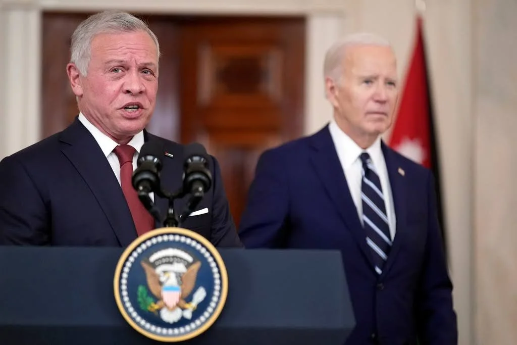 Jordan's King Abdullah II speaks at the White House in front of U.S. President Joe Biden after a meeting to discuss the war in Gaza, as well as other ongoing affairs, Feb. 12, 2024. (AP Photo/Andrew Harnik)