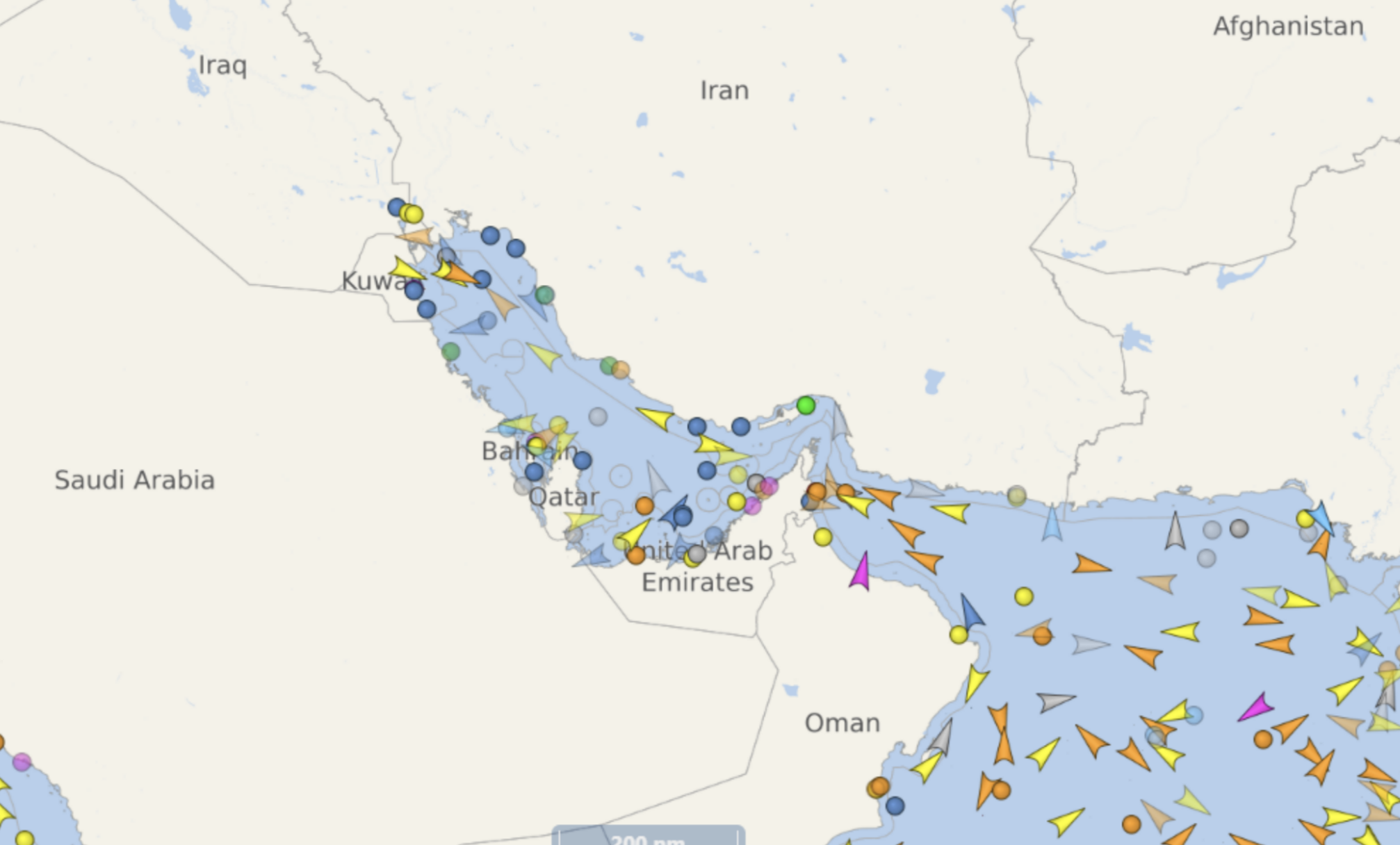 Oil tankers and other cargo ships near Iran and the UAE on November 7, 2022. Photo: Screenshot from Vessel Finder.
