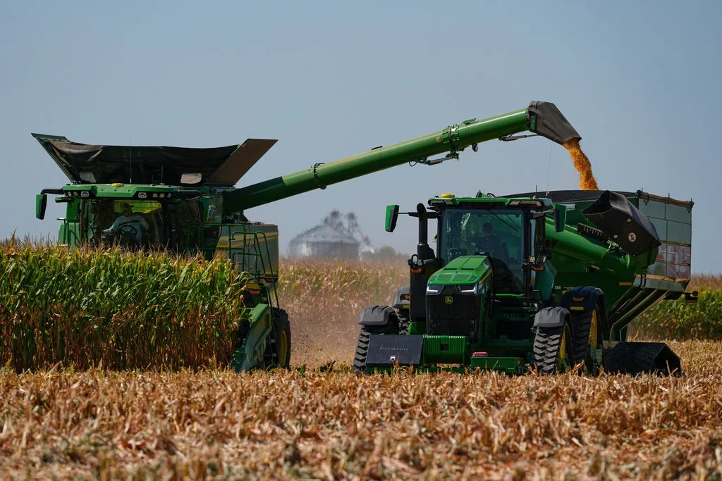 Brian Warpup offloads corn as he harvest on his farm in Warren, Ind., Thursday, Sept. 11, 2025. (AP Photo/Michael Conroy)