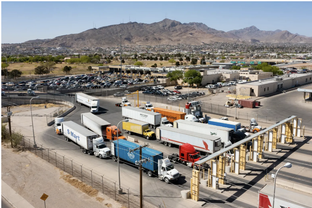 Commercial trucks awaiting inspection at the US-Mexico border in April, 2022. Photo: Ivan Pierre Aguirre / The Texas Tribune