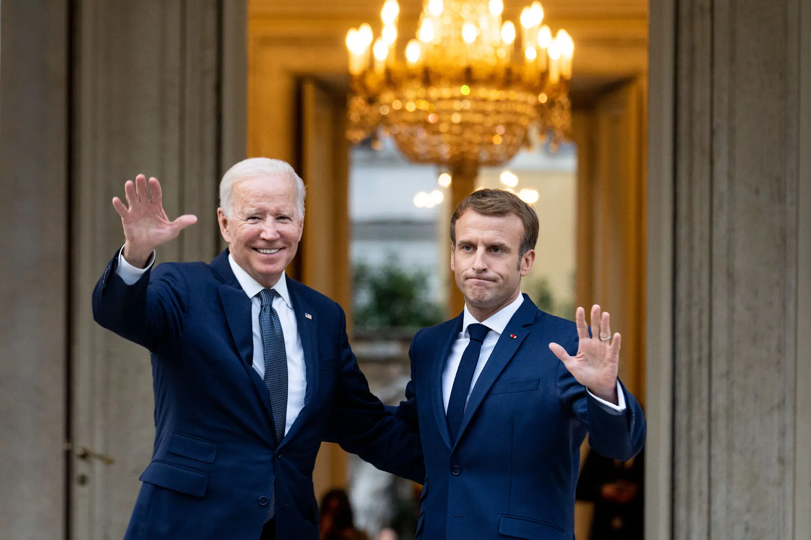 President Biden and President Macron waving to an audience in Rome, 2021. Source: Erin Schaff/The New York Times