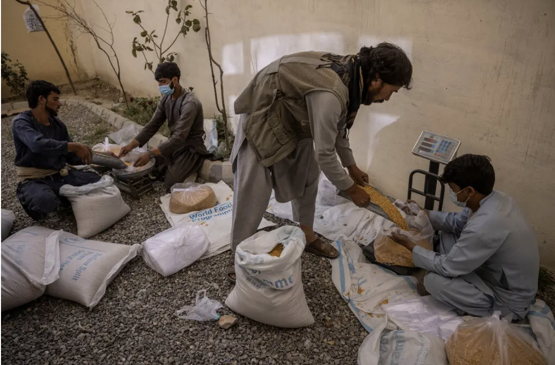 Workers in Kabul handing out rationed food provided by the World Food Program. Photo: Victor J. Blue / The New York Times