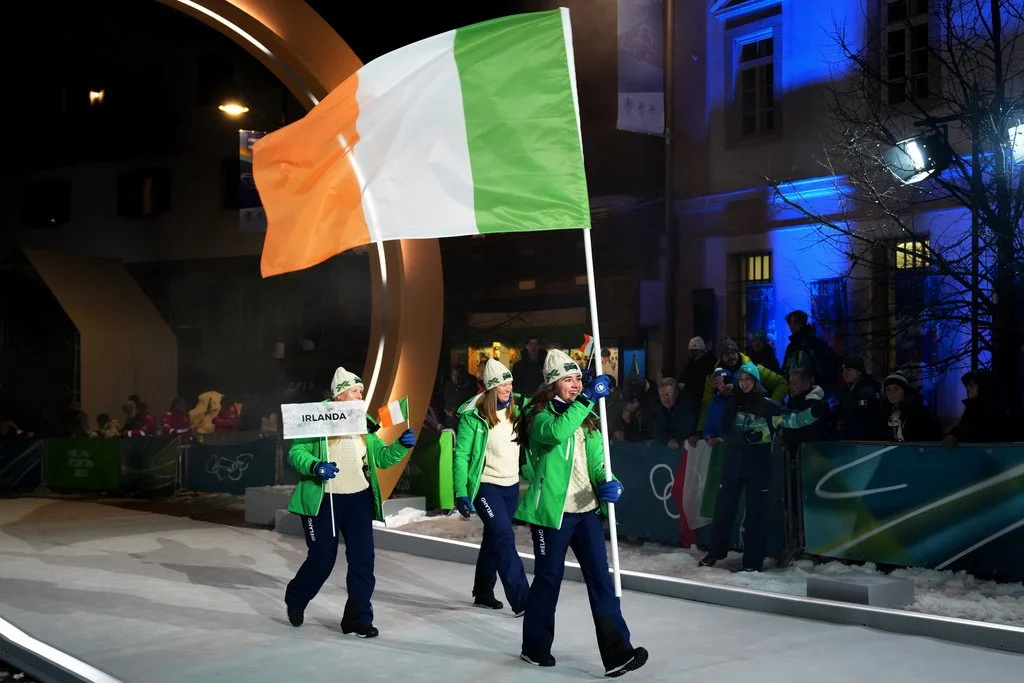 Anabelle Zurbay, flag bearer of Ireland, leads her team in during the Olympic opening ceremony at the 2026 Winter Olympics, in Cortina d'Ampezzo, Italy, Friday, Feb. 6, 2026. (AP Photo/Misper Apawu)