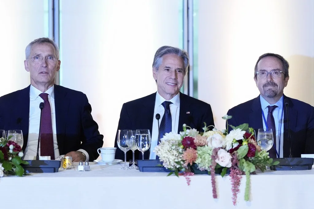 NATO Secretary General Jens Stoltenberg, U.S. Secretary of State Antony Blinken and John Bass, Department of State Acting Under Secretary for Political Affairs, pose for photos at the Transatlantic Working Dinner, Tuesday, Sept. 24, 2024, in New York. (AP Photo/Julia Demaree Nikhinson, Pool)