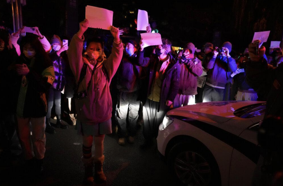 Protesters hold up blank papers and chant slogans as they march in protest of China’s strict anti-coronavirus measures in Beijing, Sunday, Nov. 27. Photo: Ng Han Guan / AP Newsroom