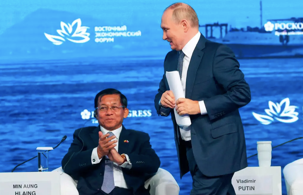 General Min Aung Hlaing of Myanmar and President Putin of Russia met at a forum in Vladivostok. Source: Sergei Bobylev/TASS News Agency
