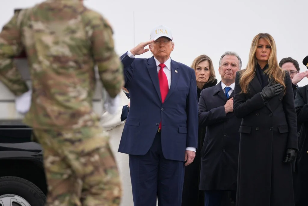 An Army carry team carry a flag-draped transfer case with the remains of U.S. Army Reserve soldier Capt. Cody Khork, 35, of Winter Haven, Fla., who was killed in a drone strike at a command center in Kuwait after the U.S. and Israel launched its military campaign against Iran, past President Donald Trump and first lady Melania Trump during a casualty return, Saturday, March 7, 2026, at Dover Air Force Base, Del. (AP Photo/Mark Schiefelbein)