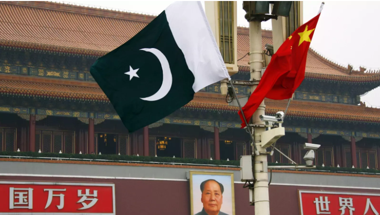 A Pakistani national flag flies alongside a Chinese national flag in front of the portrait of Chairman Mao Zedong on Beijing's Tiananmen Square. Photo: Reuters/David Gray
