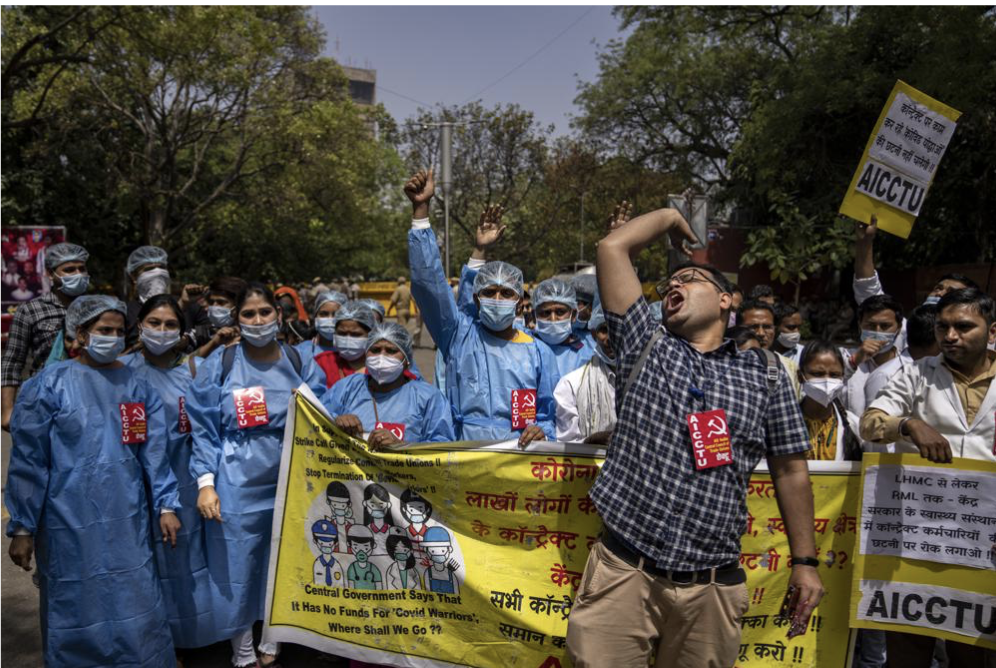 Indian workers gather outside asking for better pay. Photo: AP News