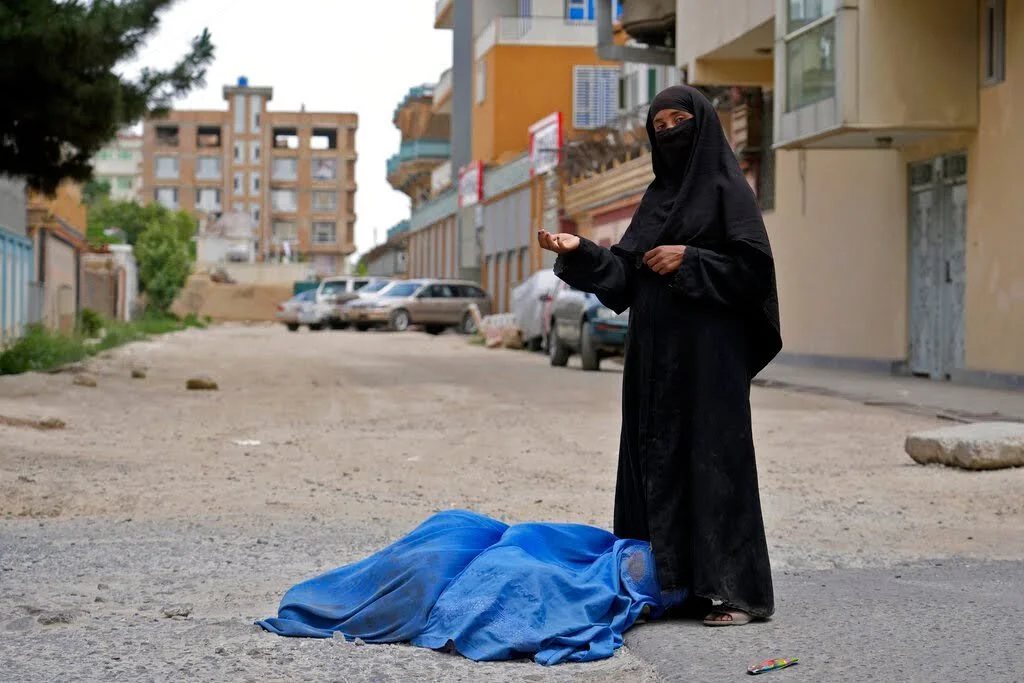 A woman begging for money and food on a street in Downtown Kabul (AP Photo/Ebrahim Noroozi)