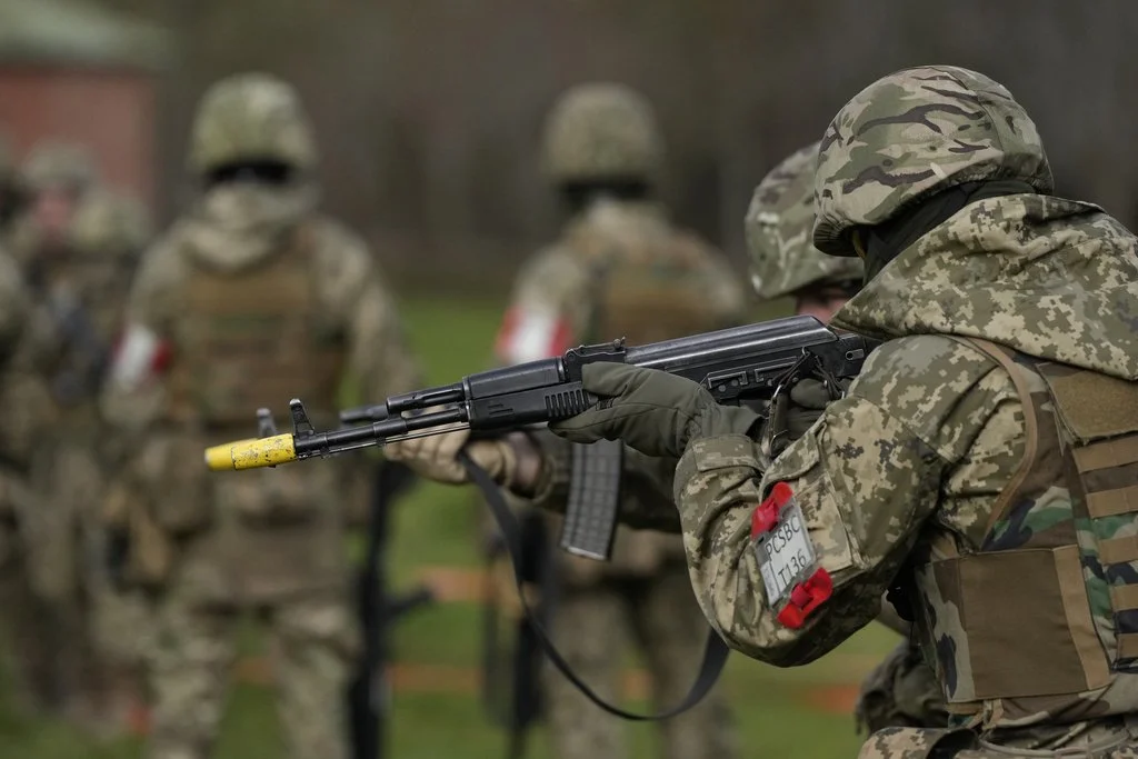 Ukrainian recruits under the guidance of British soldiers train at an army camp in South West England, Tuesday, Feb. 20, 2024. The recruits were being instructed on urban warfare. (AP Photo/Alastair Grant)